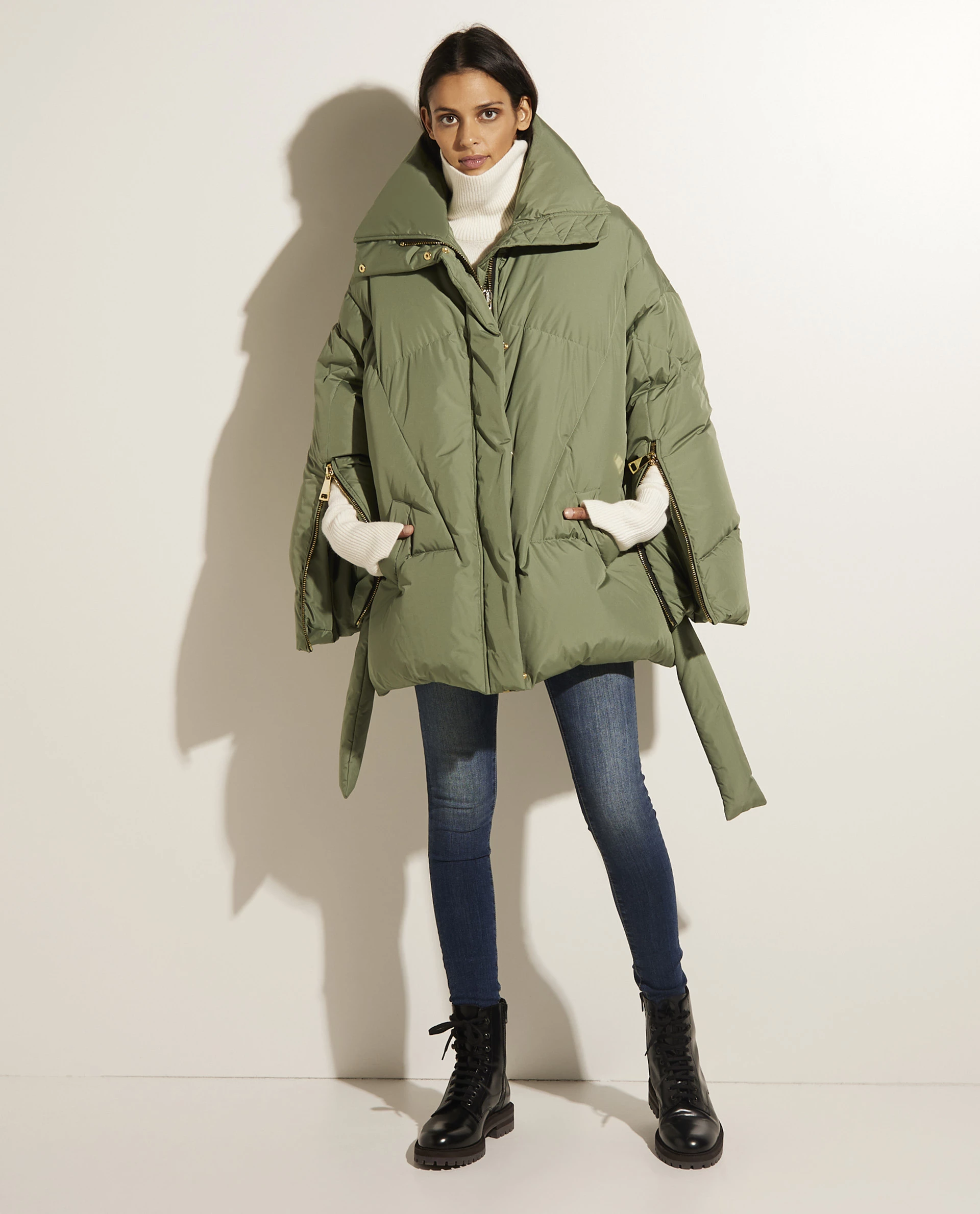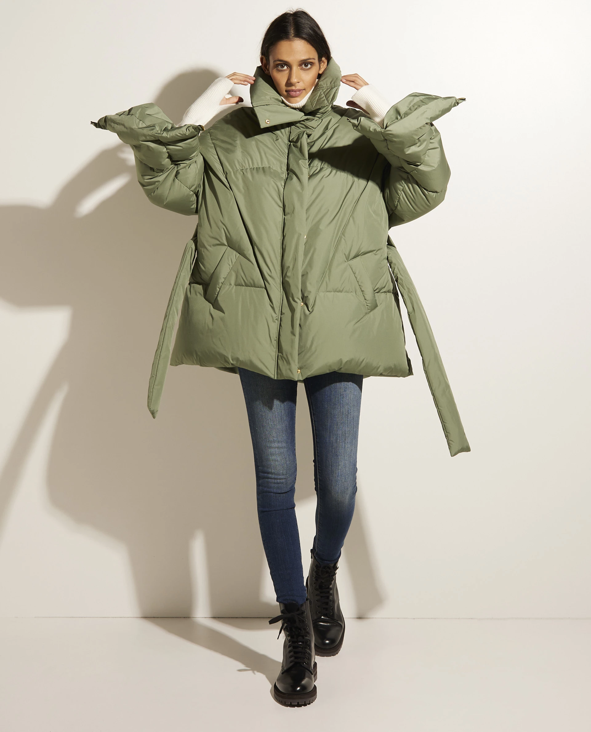 Voluminous short coat by Khrisjoy, provided with a matching belt. This puffer features an oversized silhouette.