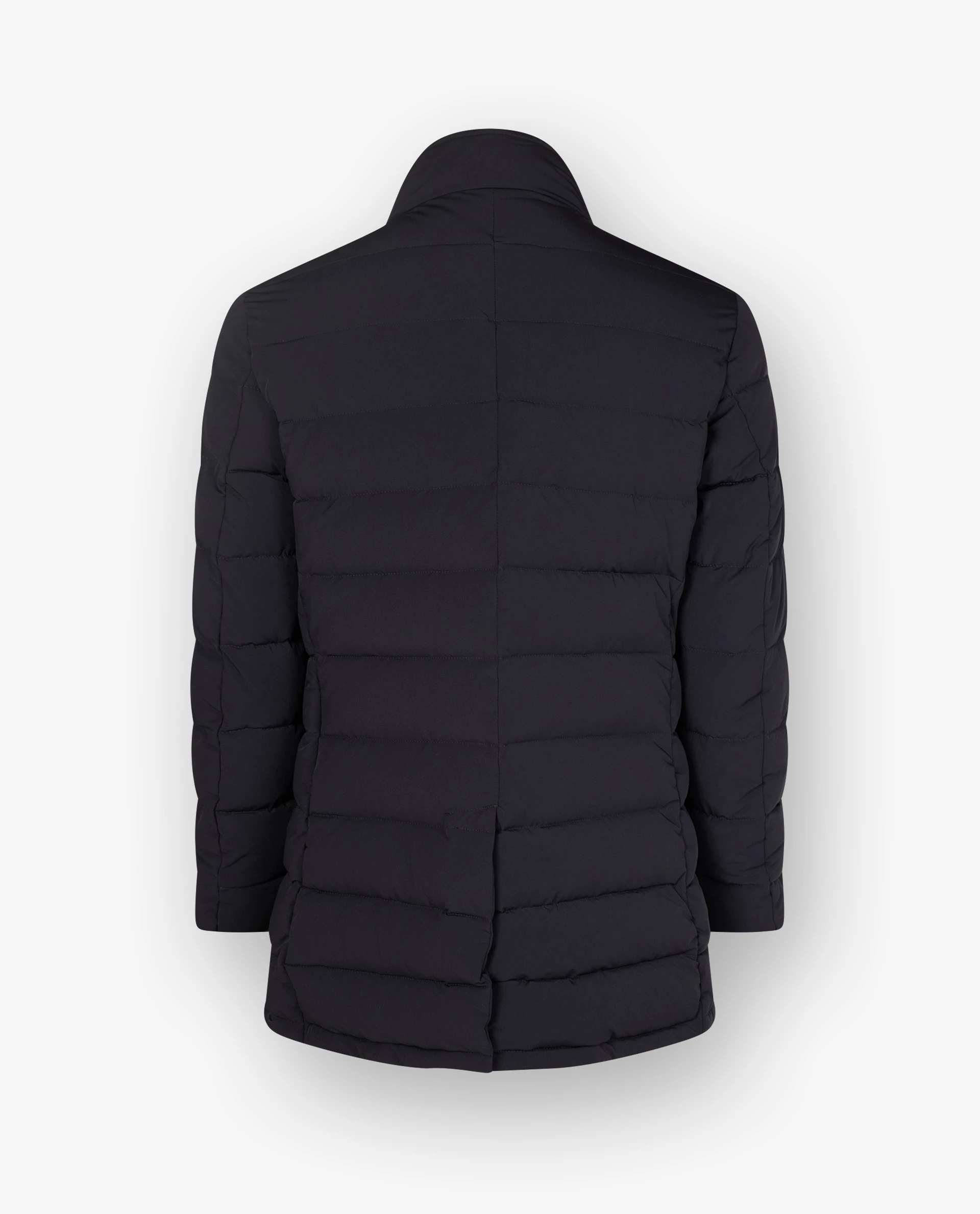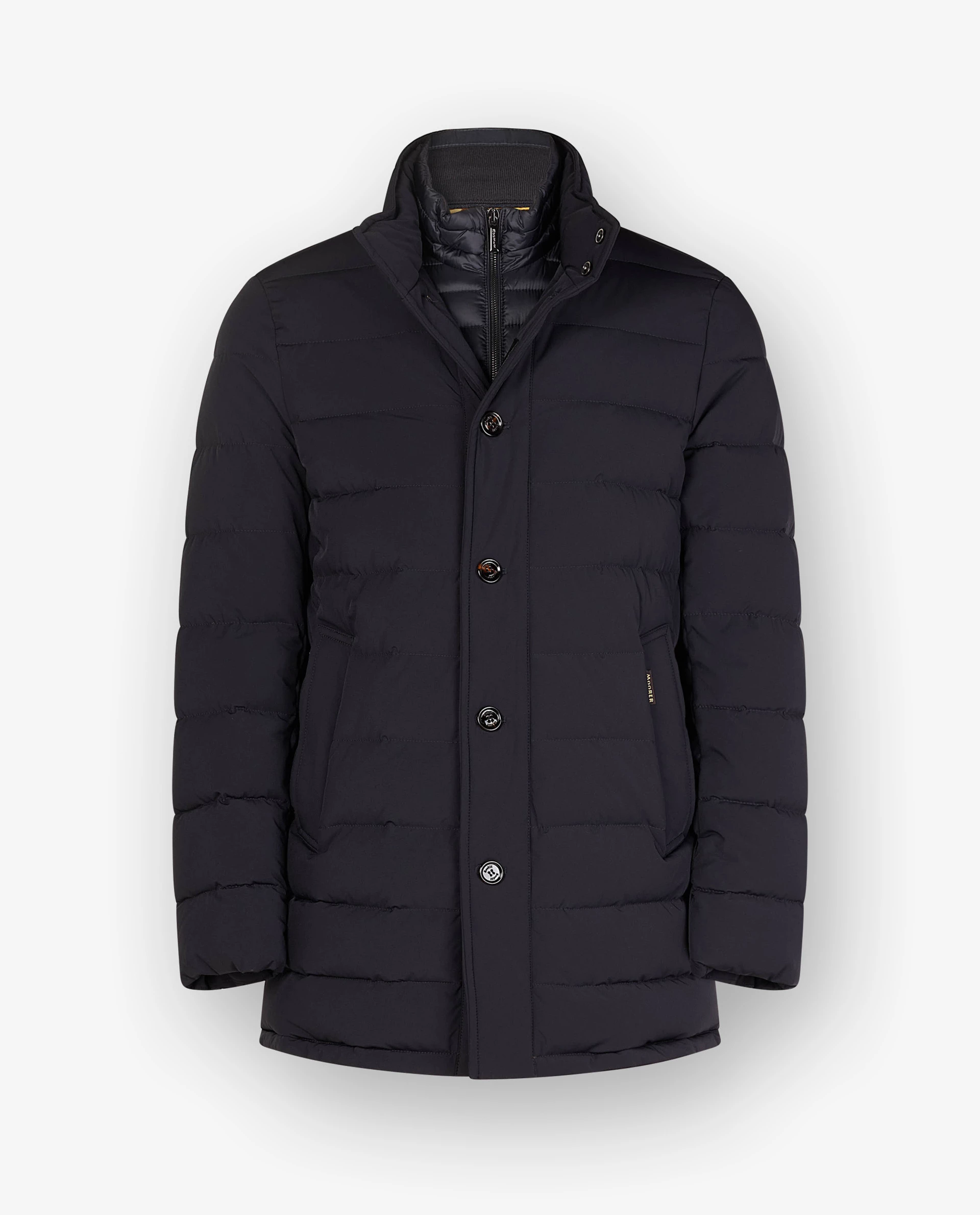 This single breasted coat by Moorer is filled with goose feathers and has a detachable quilted vest. The coat is water repellent and is finished with horn buttons, accessible side pockets and interior pockets.