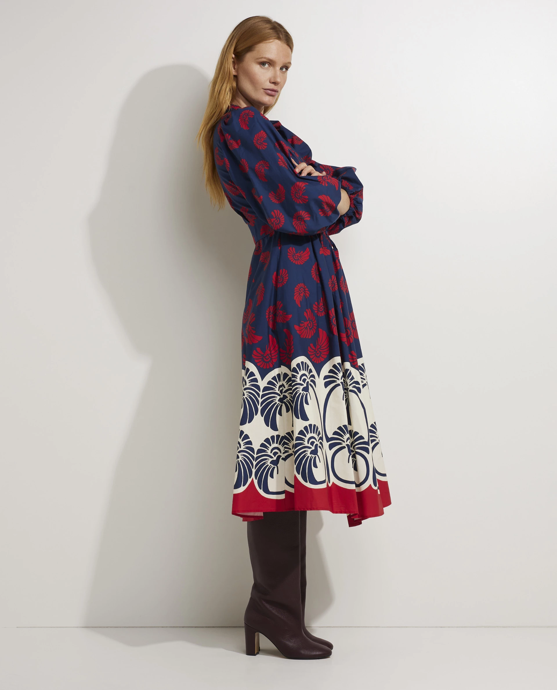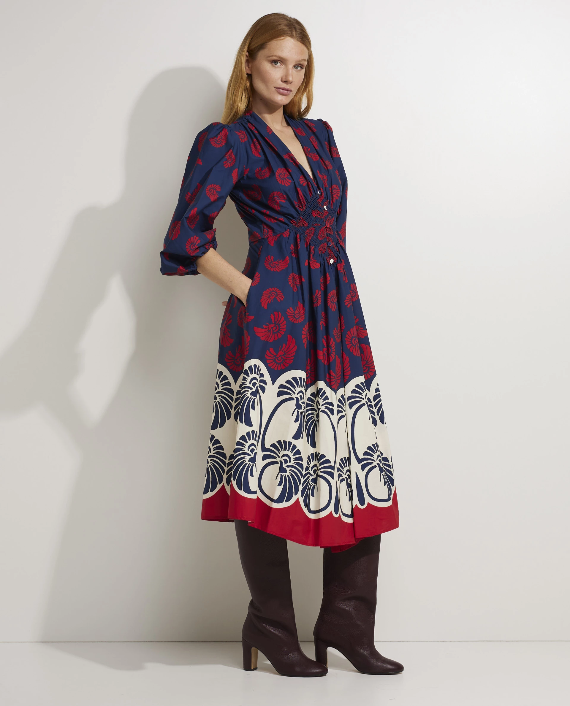 The `Camerino` dress from the Italian brand La DoubleJ is made of lightweight cotton and features a colorful print. The dress has a beautiful smocking that accentuates the waist and has a button closure at the front so that the dress can be worn both open or more closed.