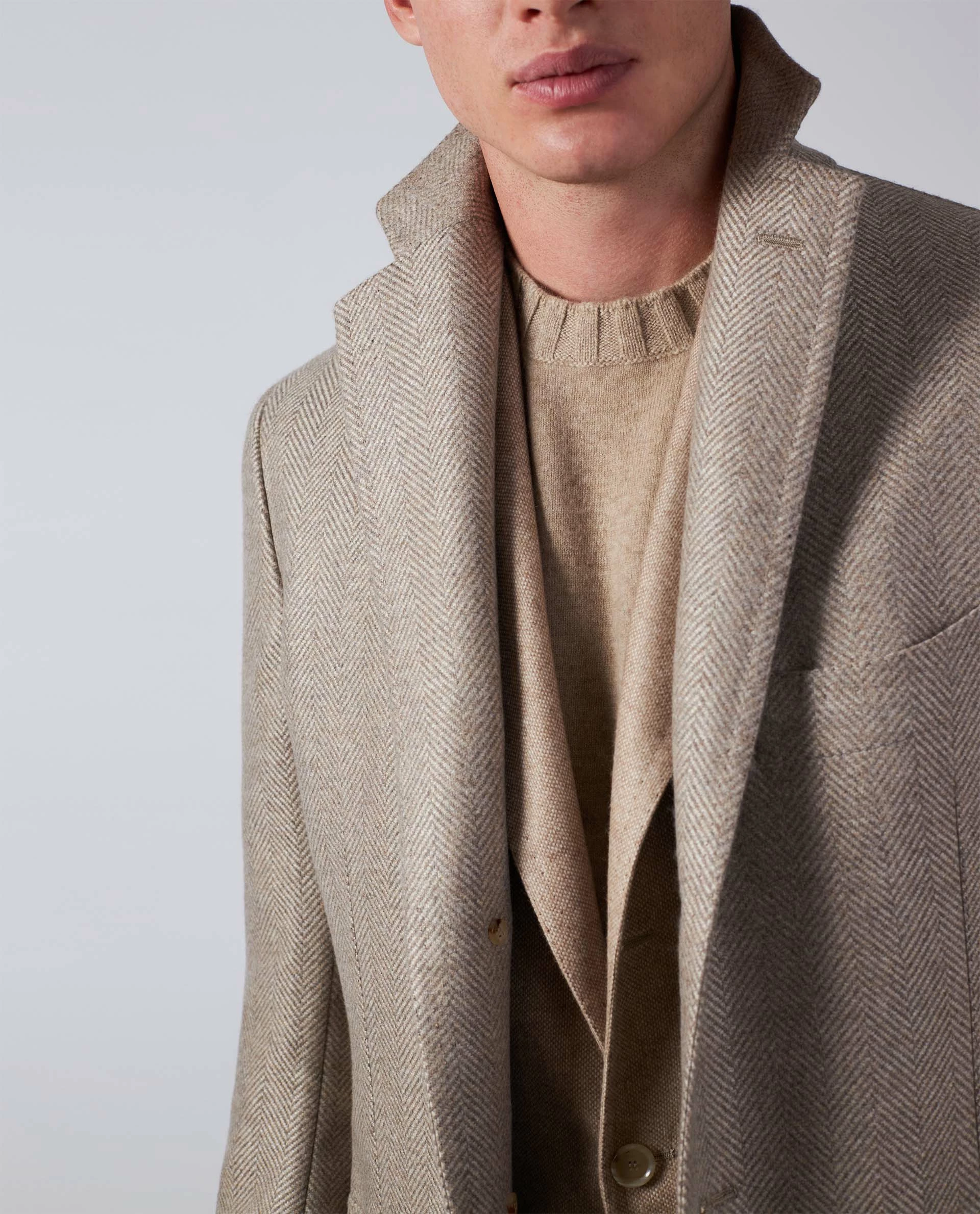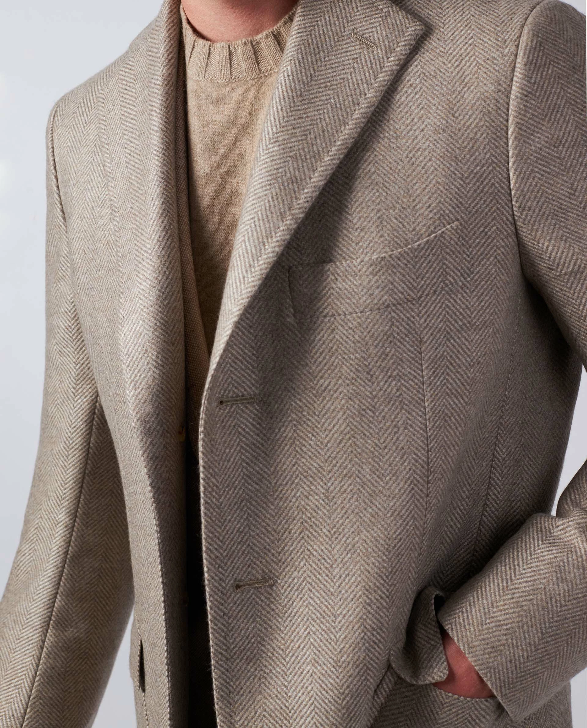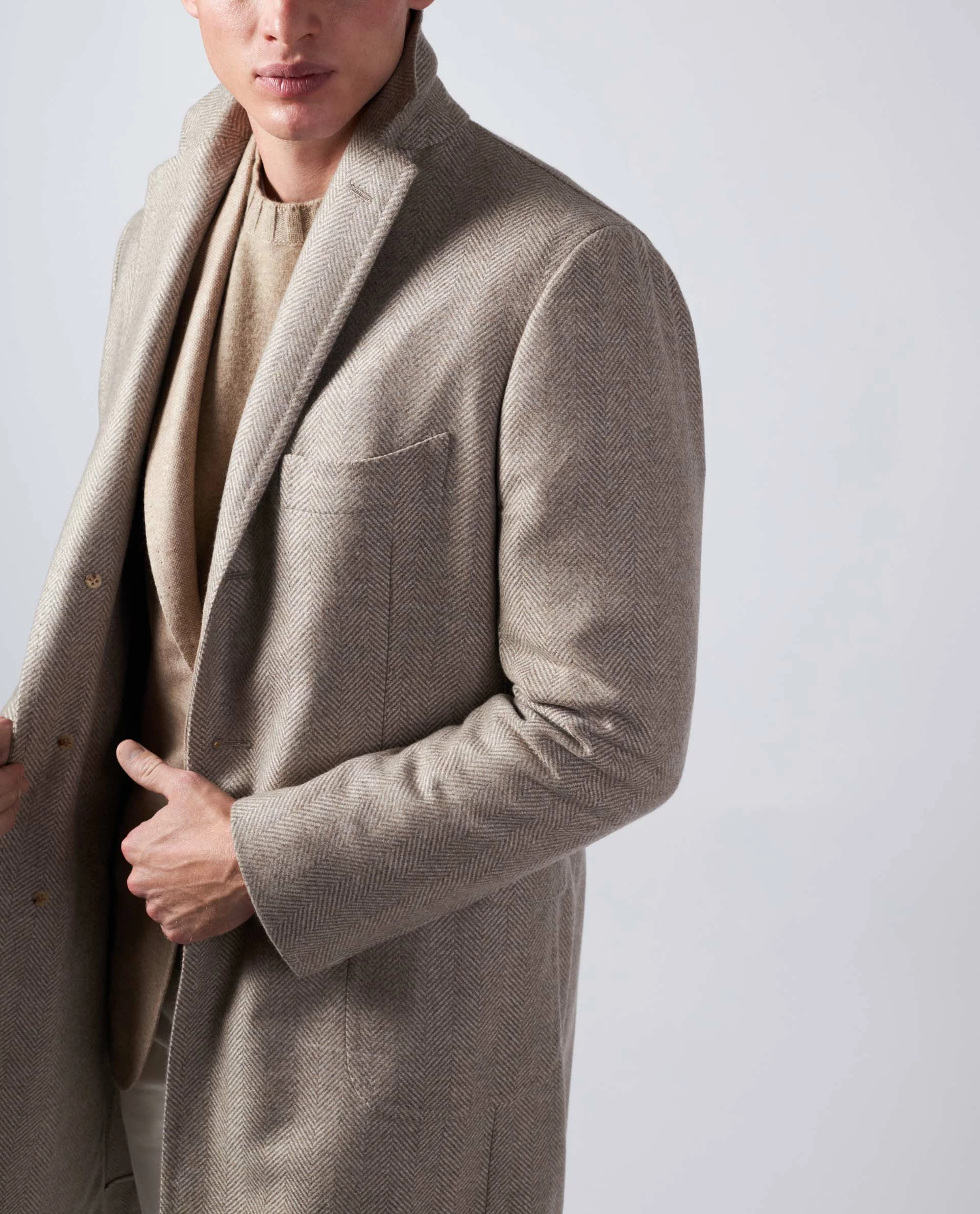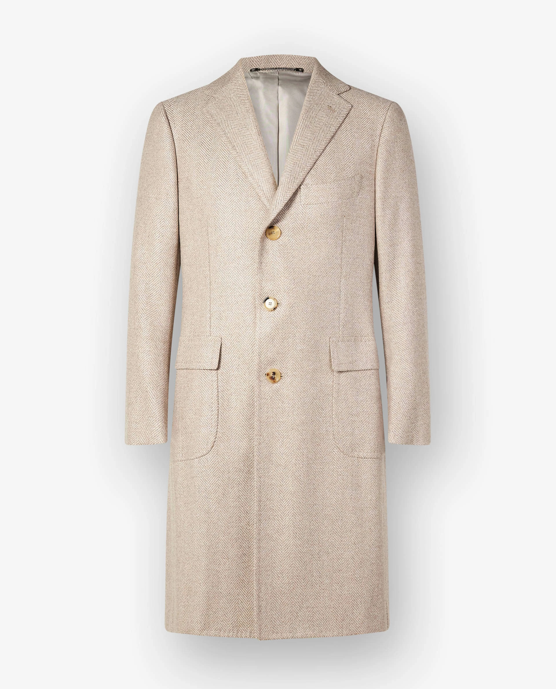 This dress coat by Cesare Attolini is crafted in cashmere, woven into a herringbone pattern. Finished with three horn buttons, a breast pocket and flap pockets. Combine this beige coat with similar colours like off-white and brown.
