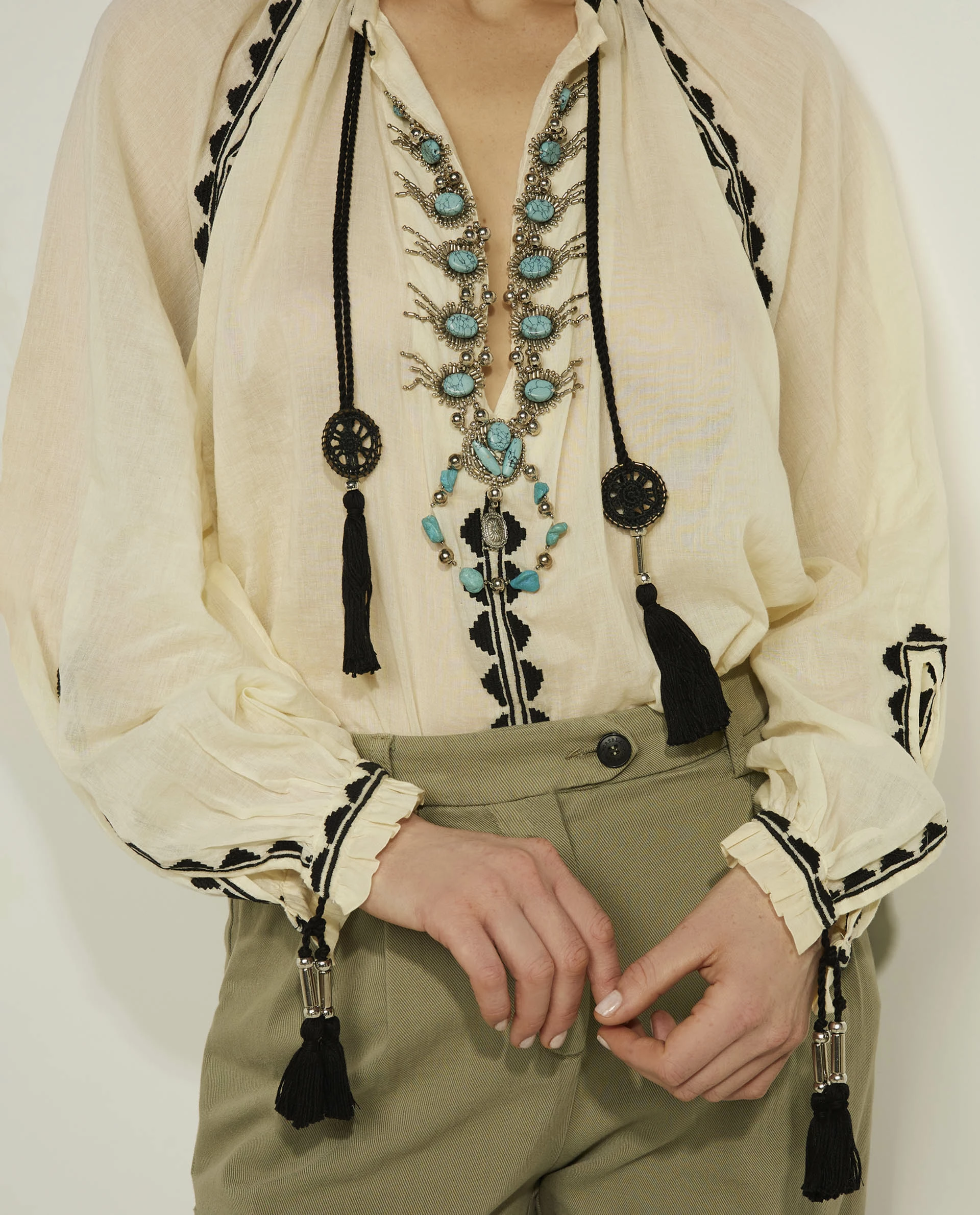 Loose-fitting blouse from the Italian brand Fortela. The `Ghodsi top` has splits in the sleeves and is finished around the neck with beautiful turquoise and silver details.