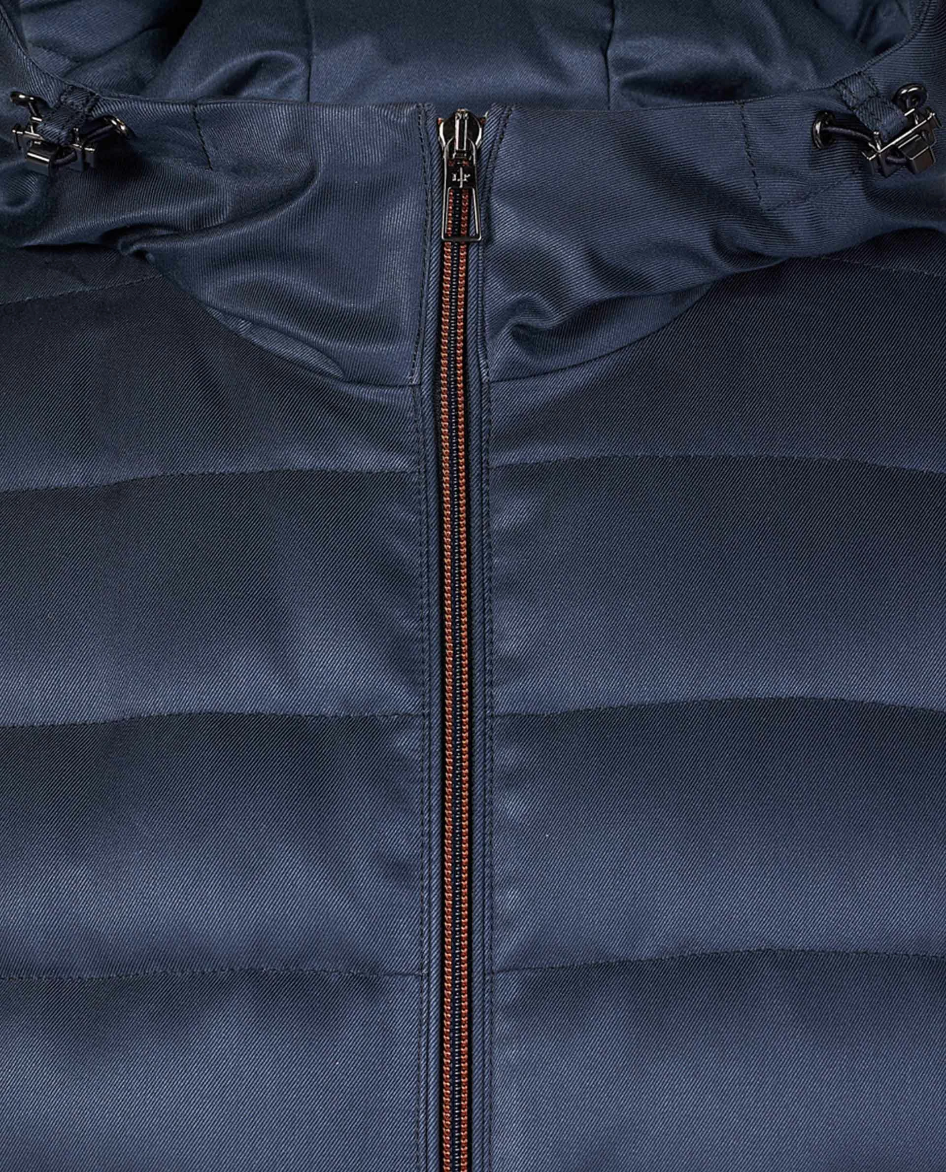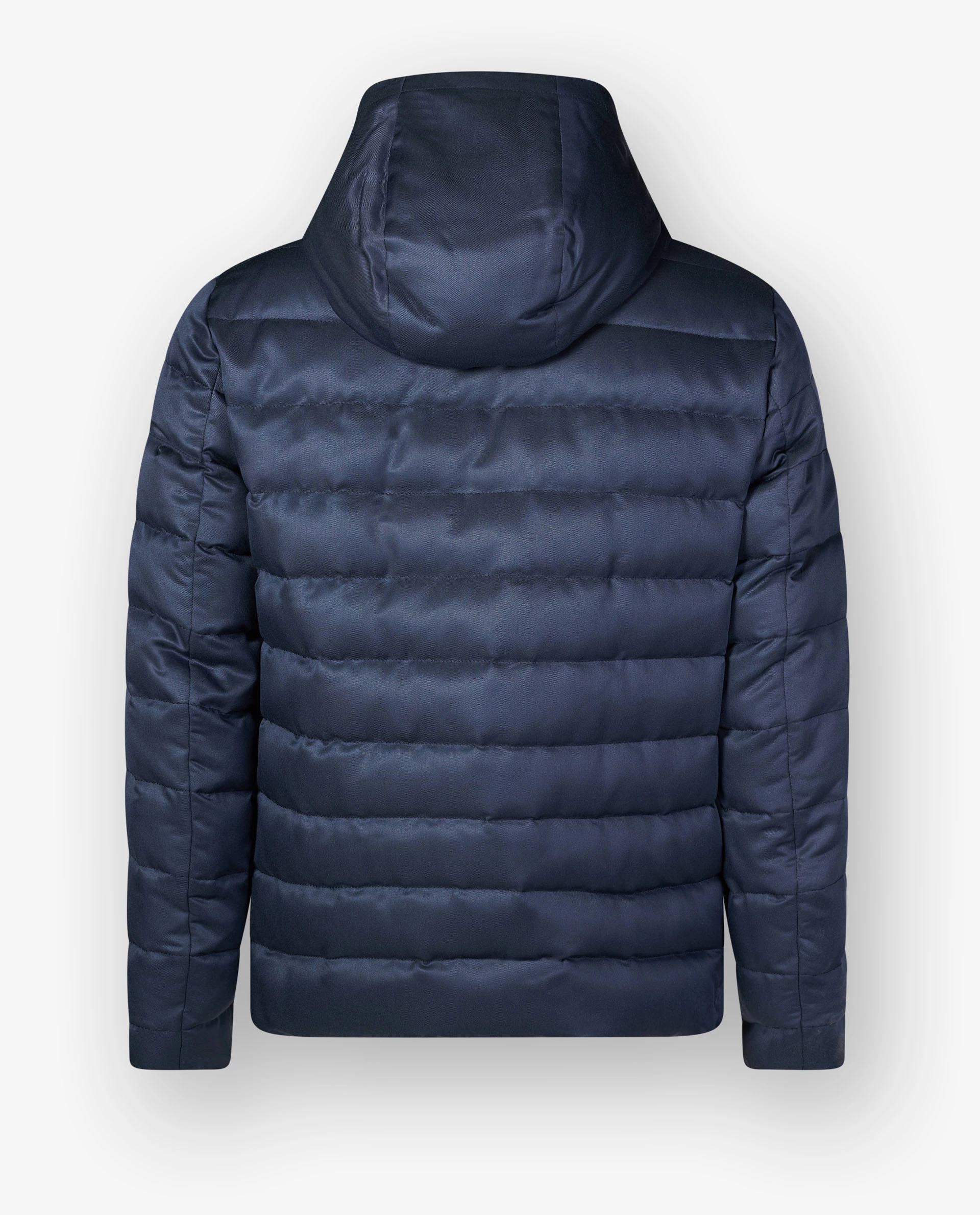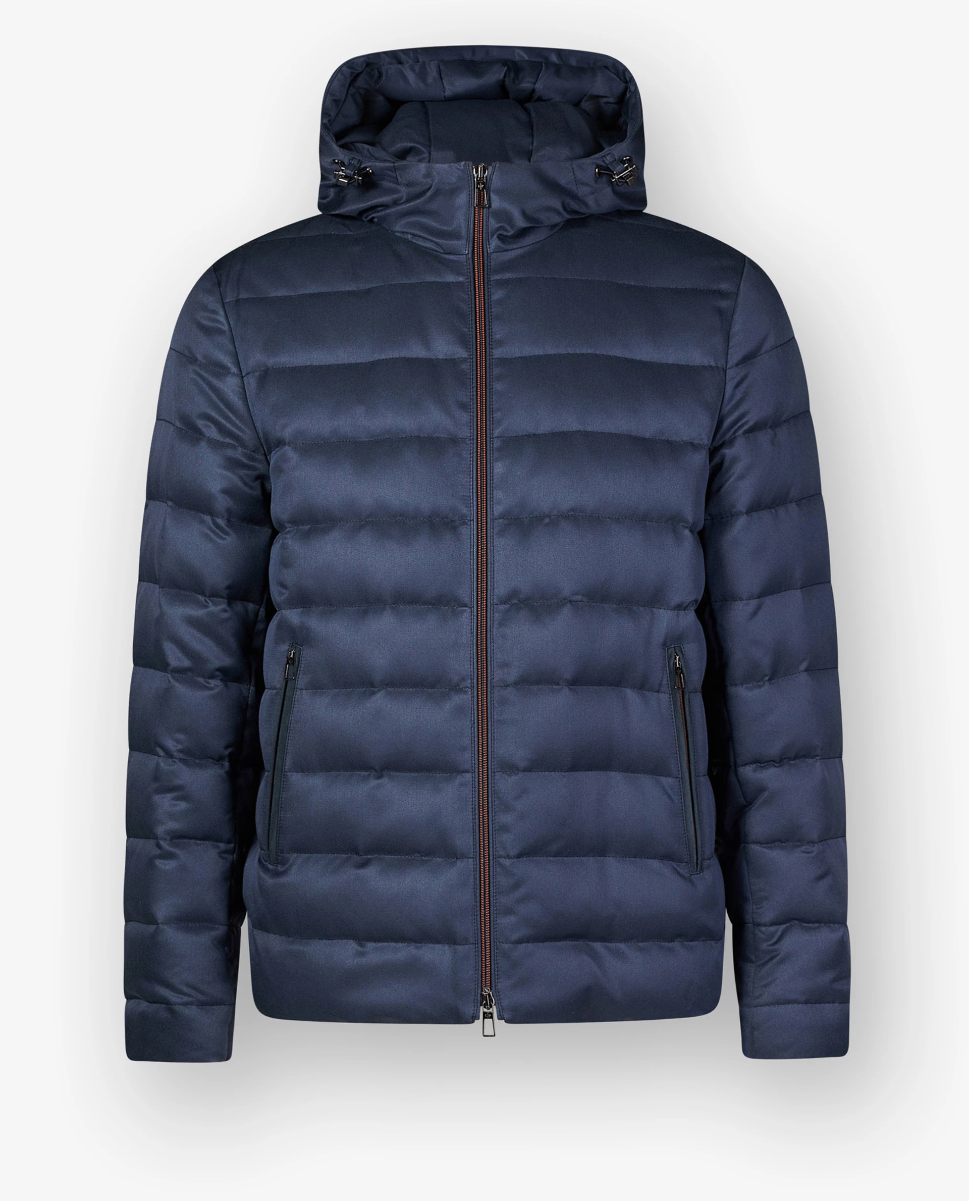 This bomber with hood by Loro Piana is crafted in silk, padded with goose down and finished with suede goatskin details. Treated with Loro Piana’s Rain System® for a water repellent finish. This coat features slit pockets and interior pockets finished with lead wire to counteract your phone’s radiation. Pair with a cashmere knit, chinos and sneakers.
