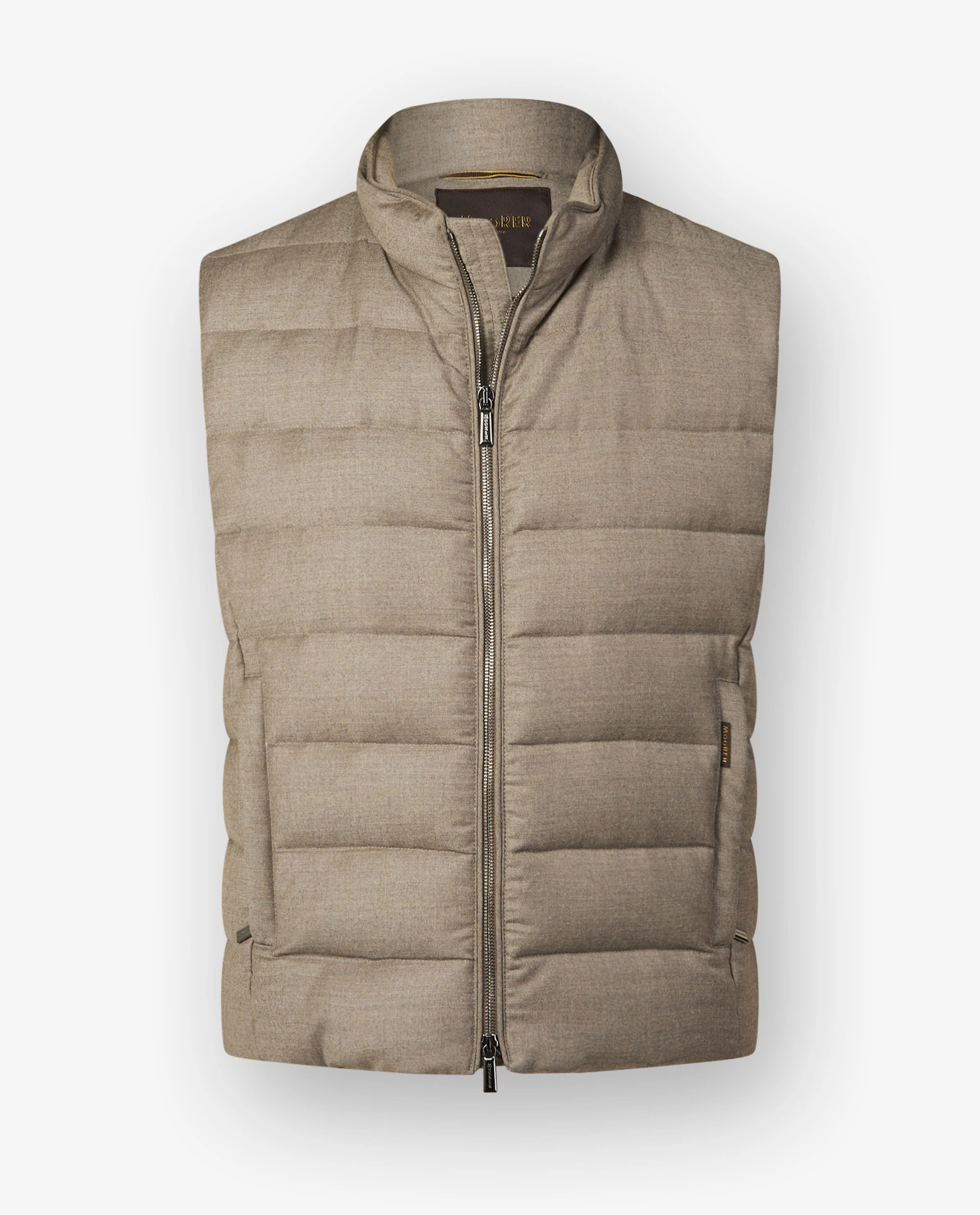 The bodywarmer by Moorer is crafted in a wool cashmere flannel and filled with goose down. The bodywarmer is finished with a double glider brushed metal zip and side pockets with invisible metal zips. For a complete leisure look, pair with a wool cashmere comfortable outfit.