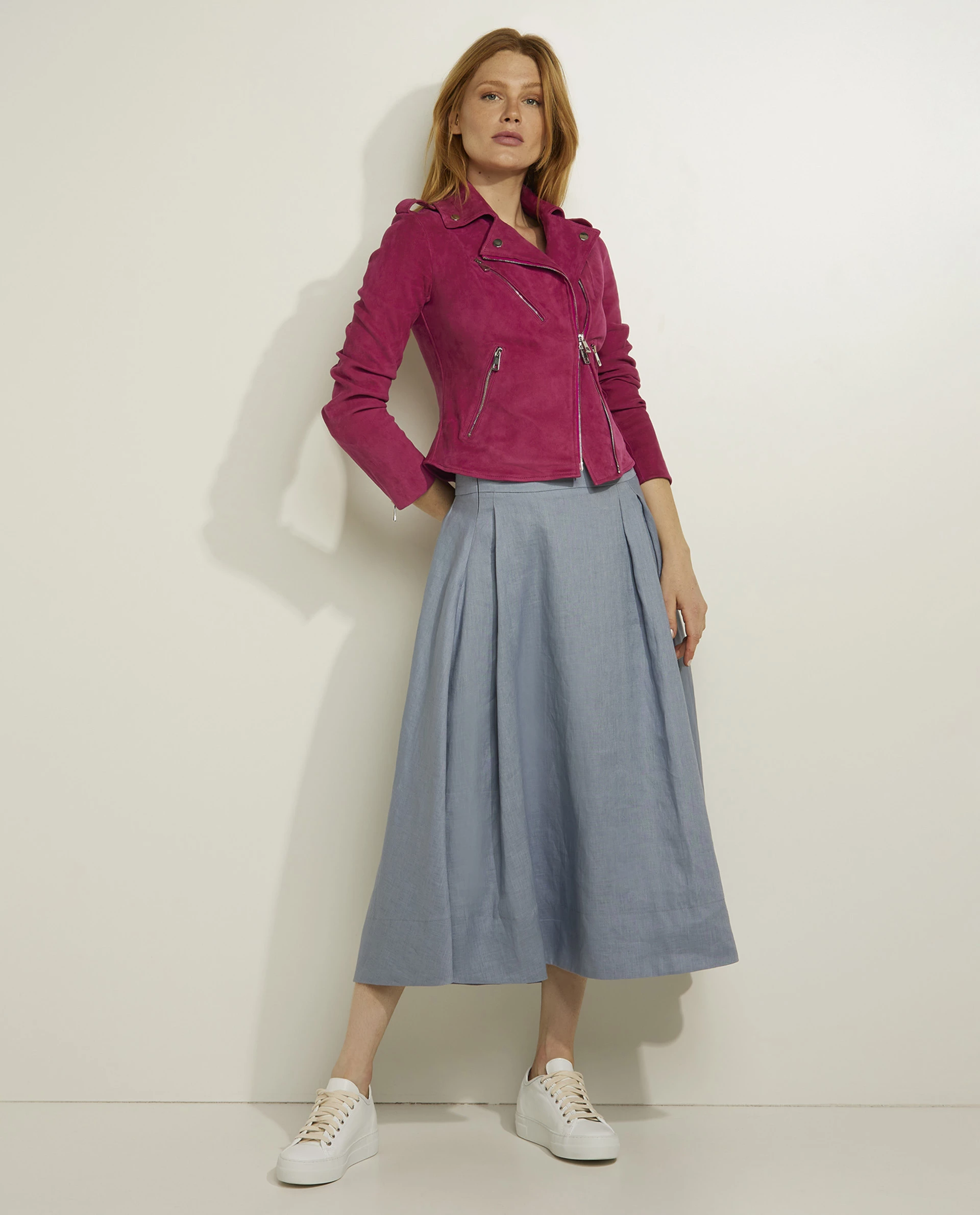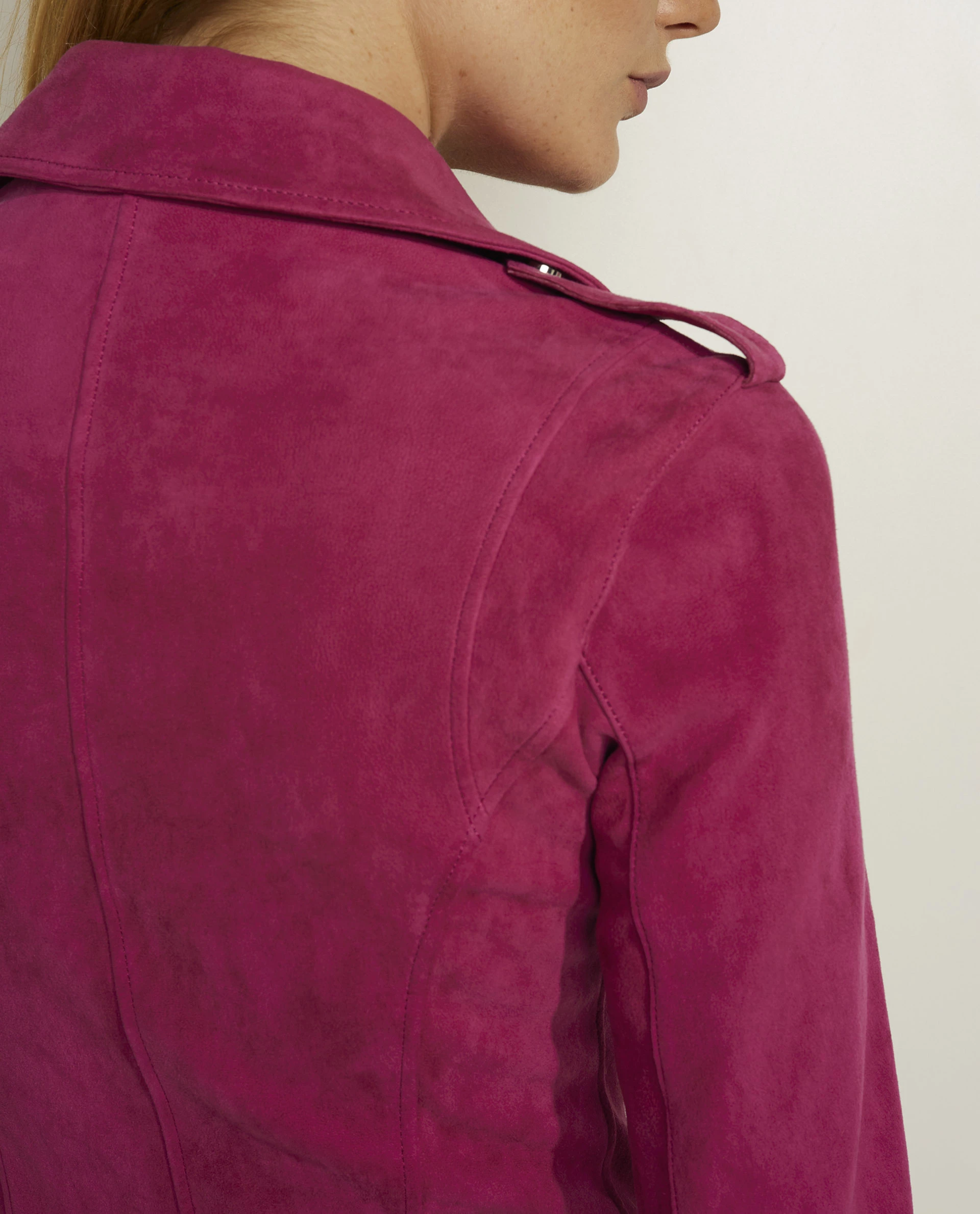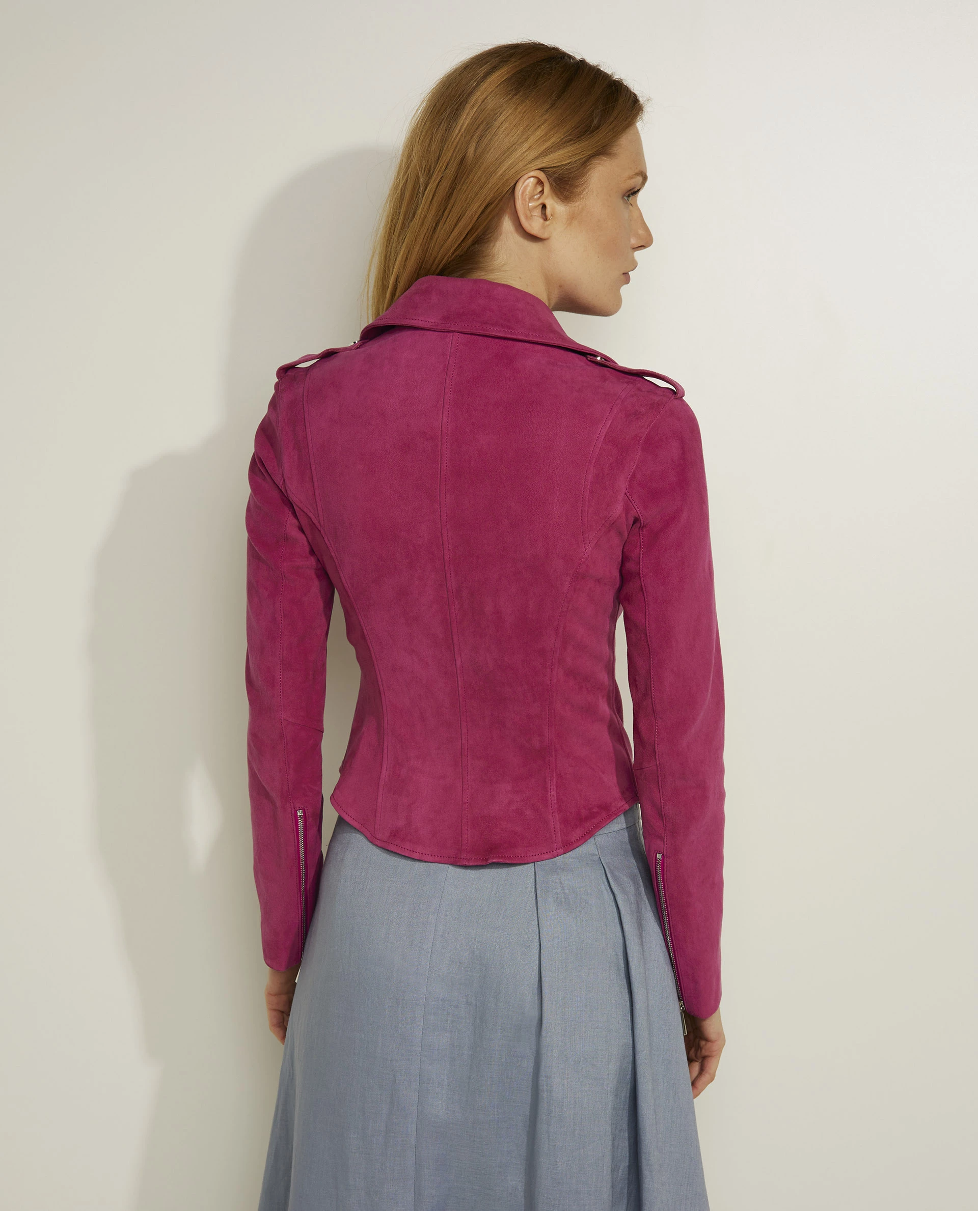 Short biker jacket from the Turkish brand Desa. The jacket is made of high-quality calf suede and can be closed at the front with an asymmetrical, divisible zipper.