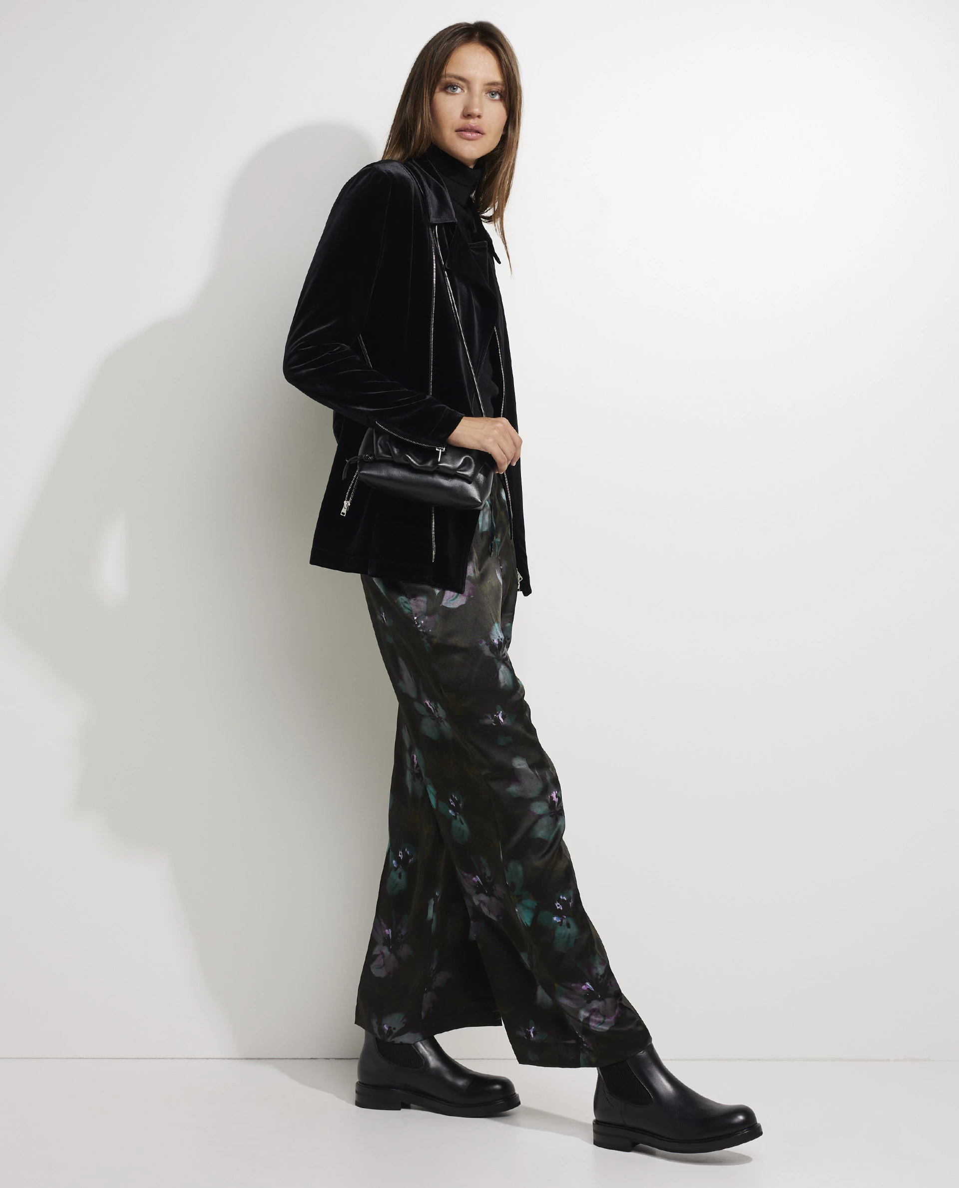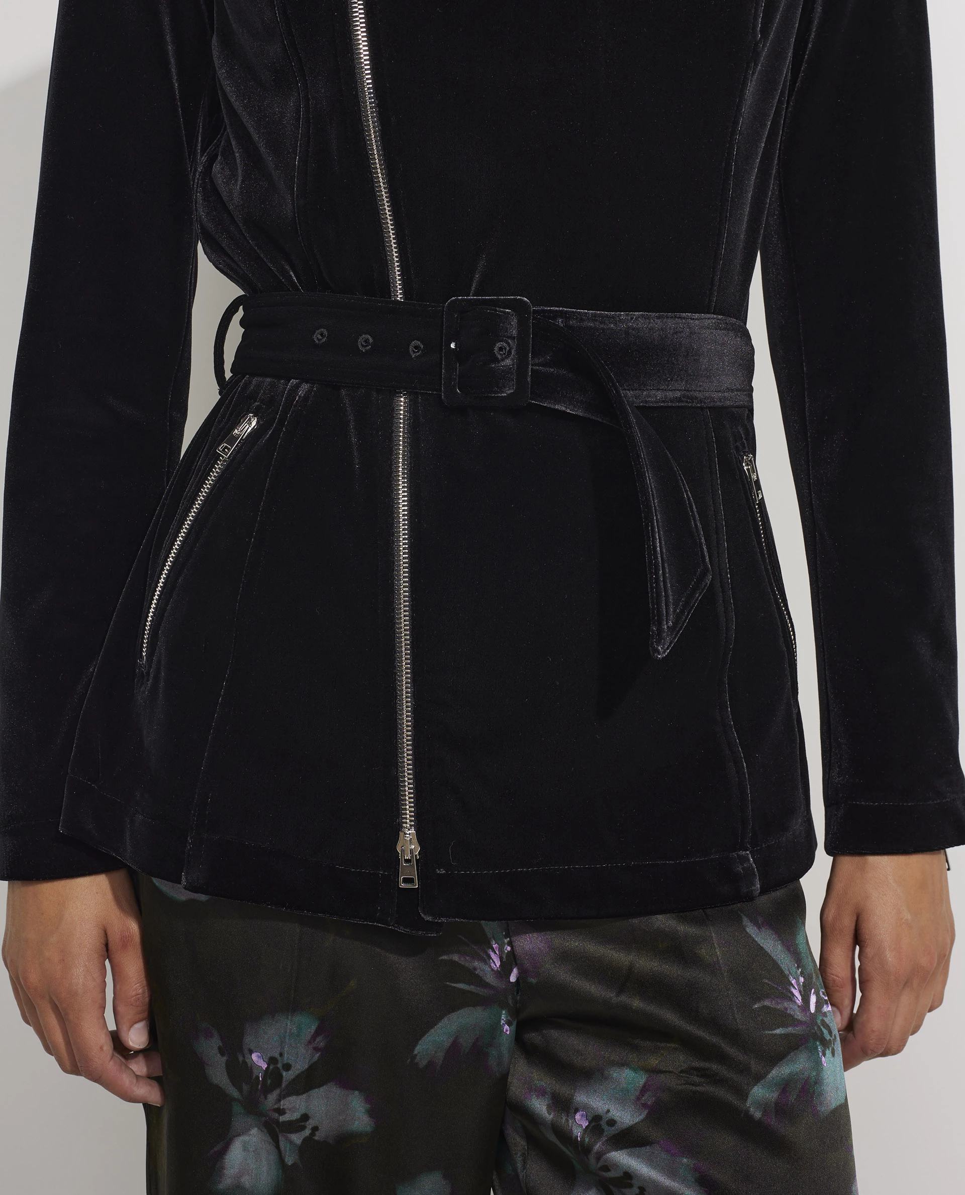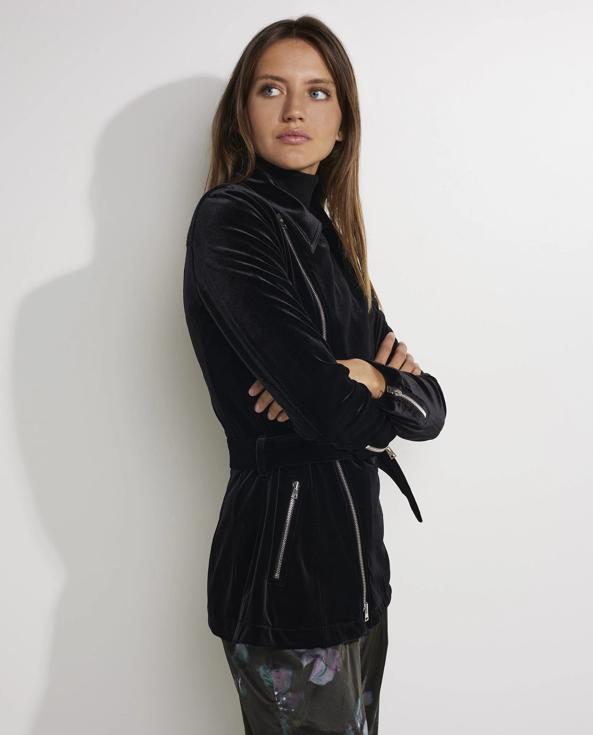 Jacket by Irie in stretch velvet quality. This model has a silver zipper and can be worn with the matching belt.