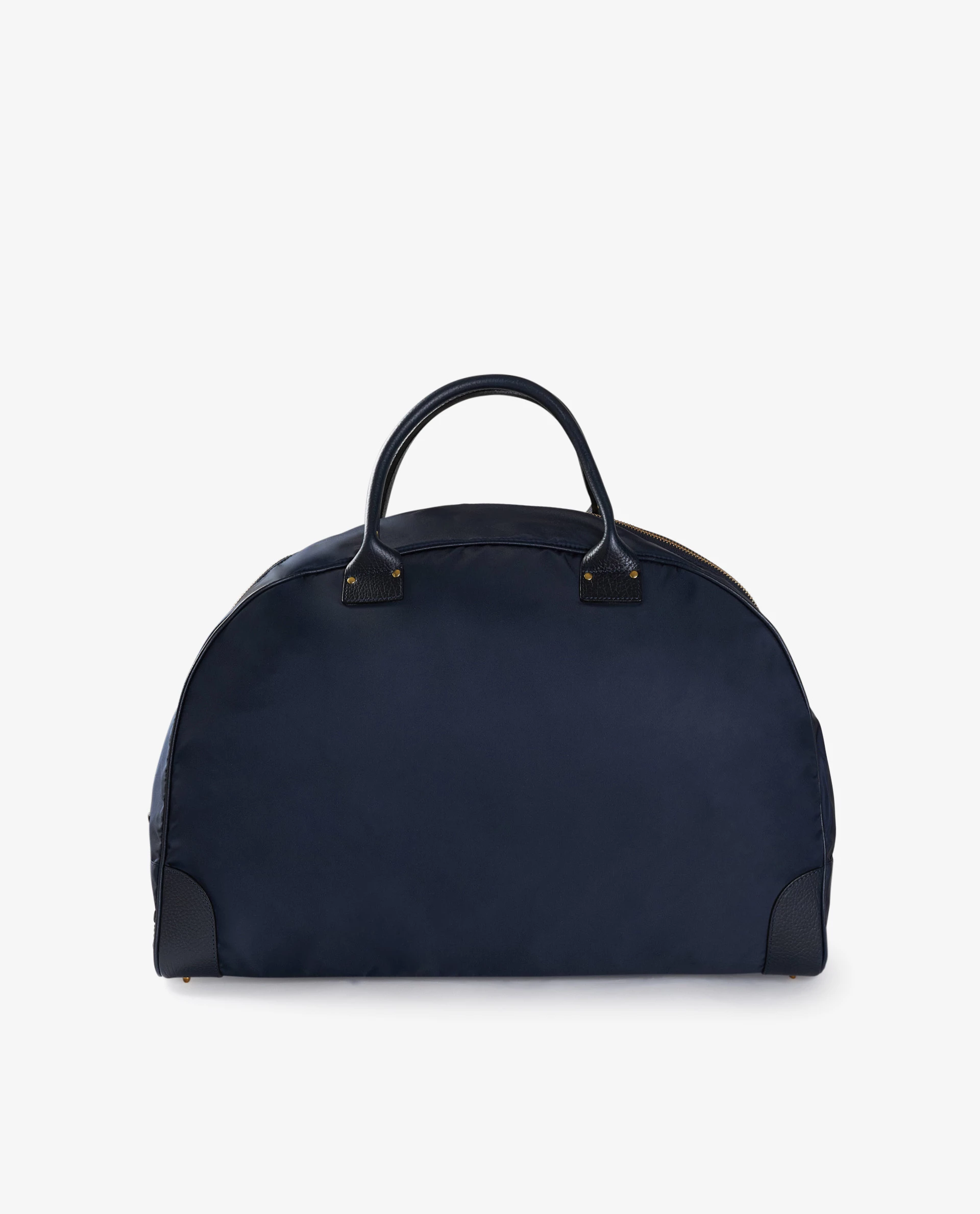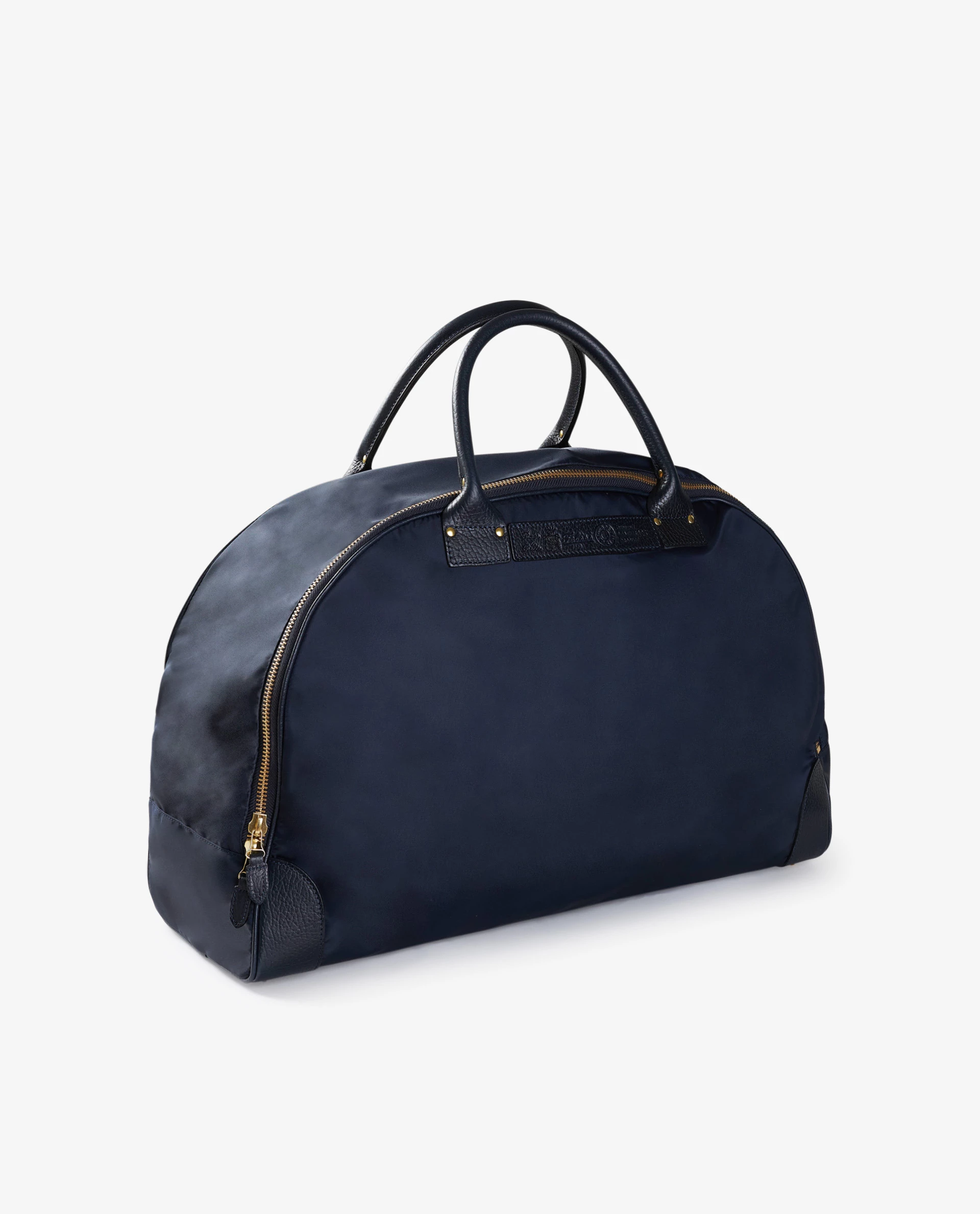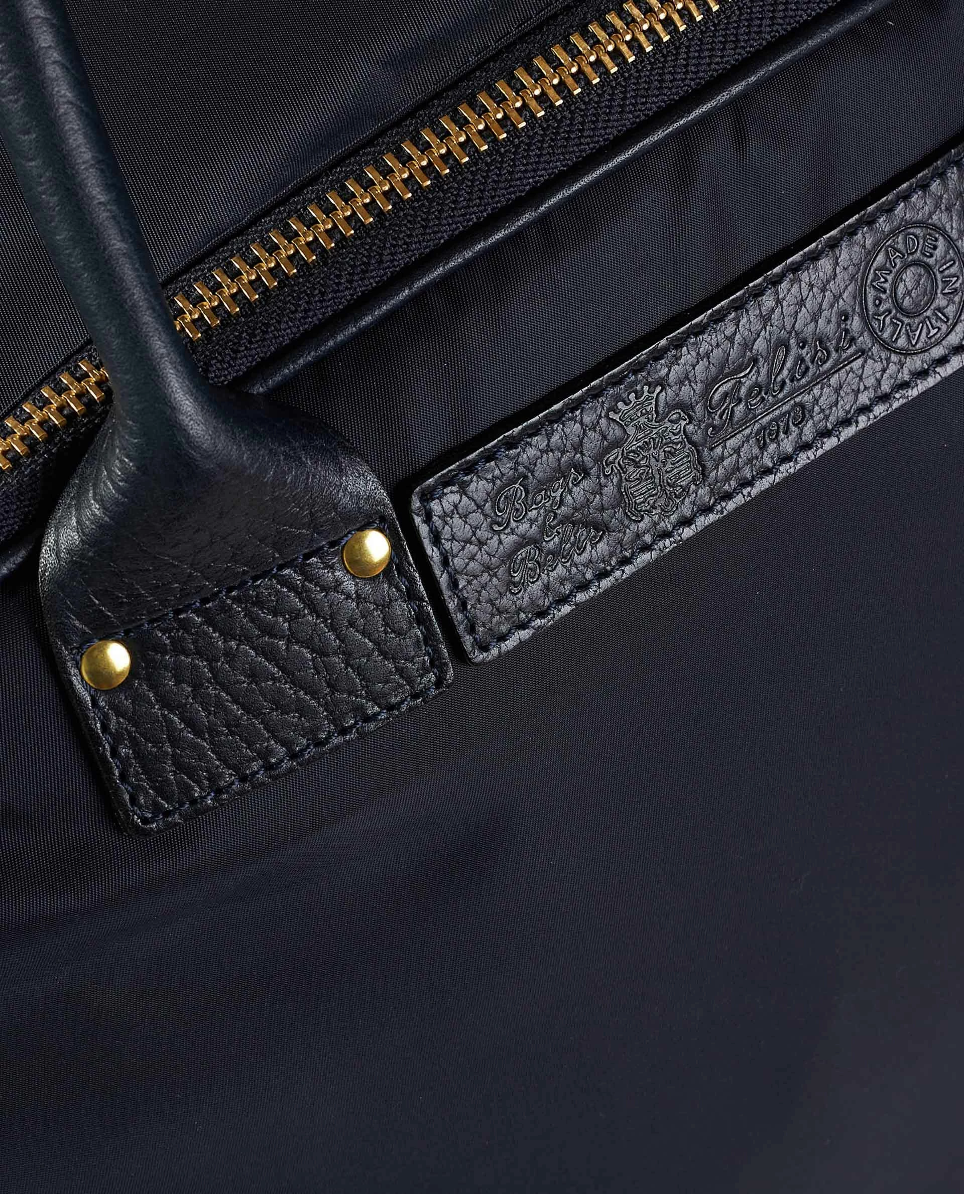 This weekend bag by Felisi is made of nylon and is finished with leather. The bag has a zipper along the side of the bag, leather corners and studs on the bottom to protect the bag when put on the ground. Perfect bag for a weekend getaway.