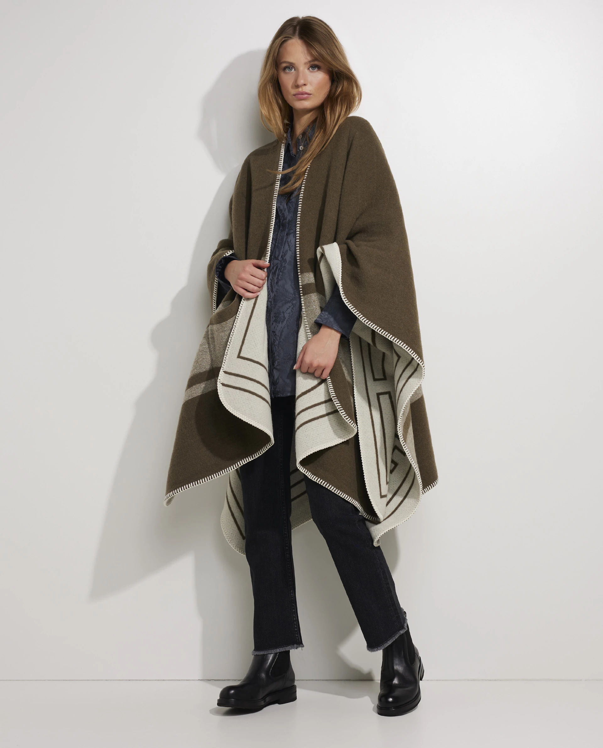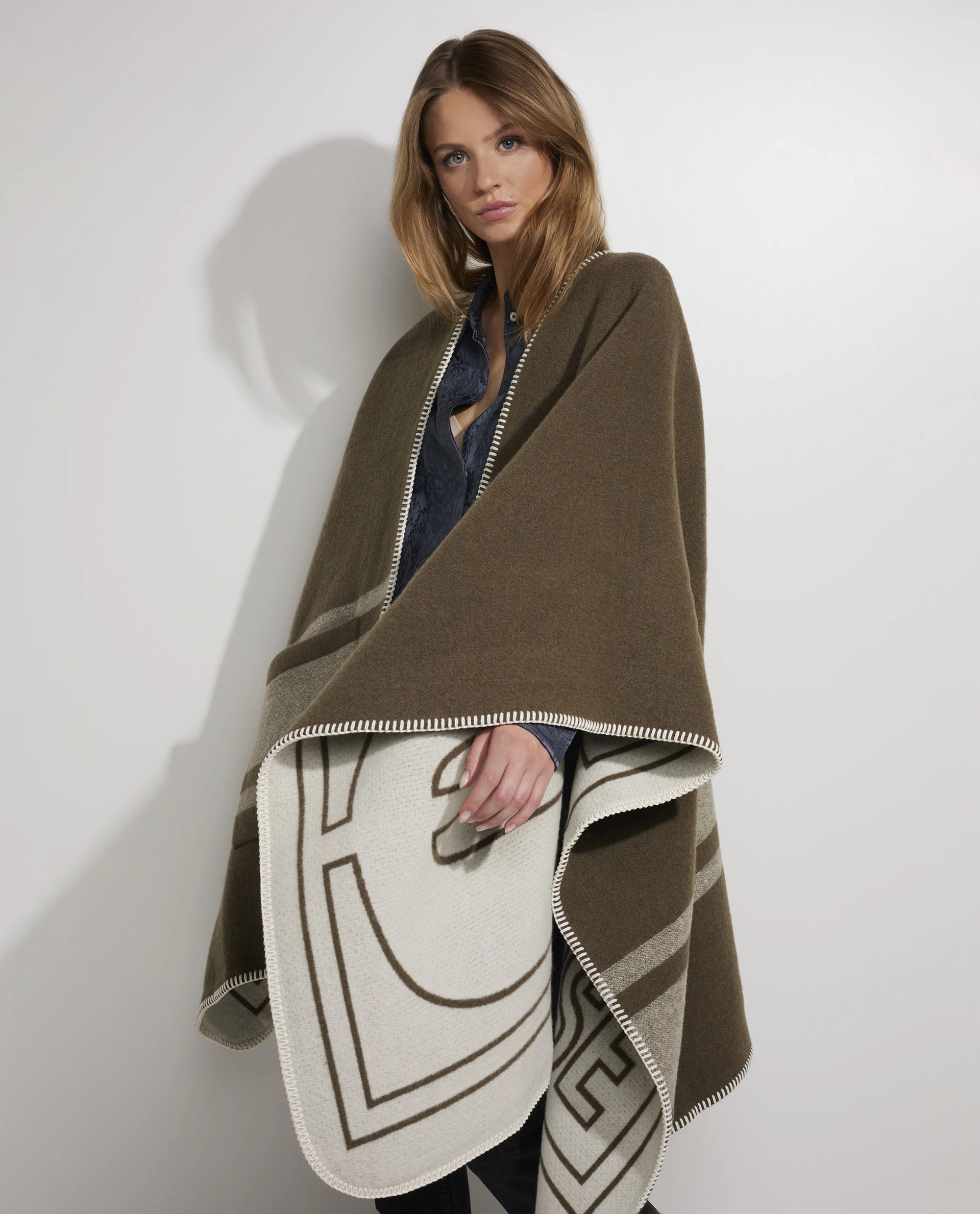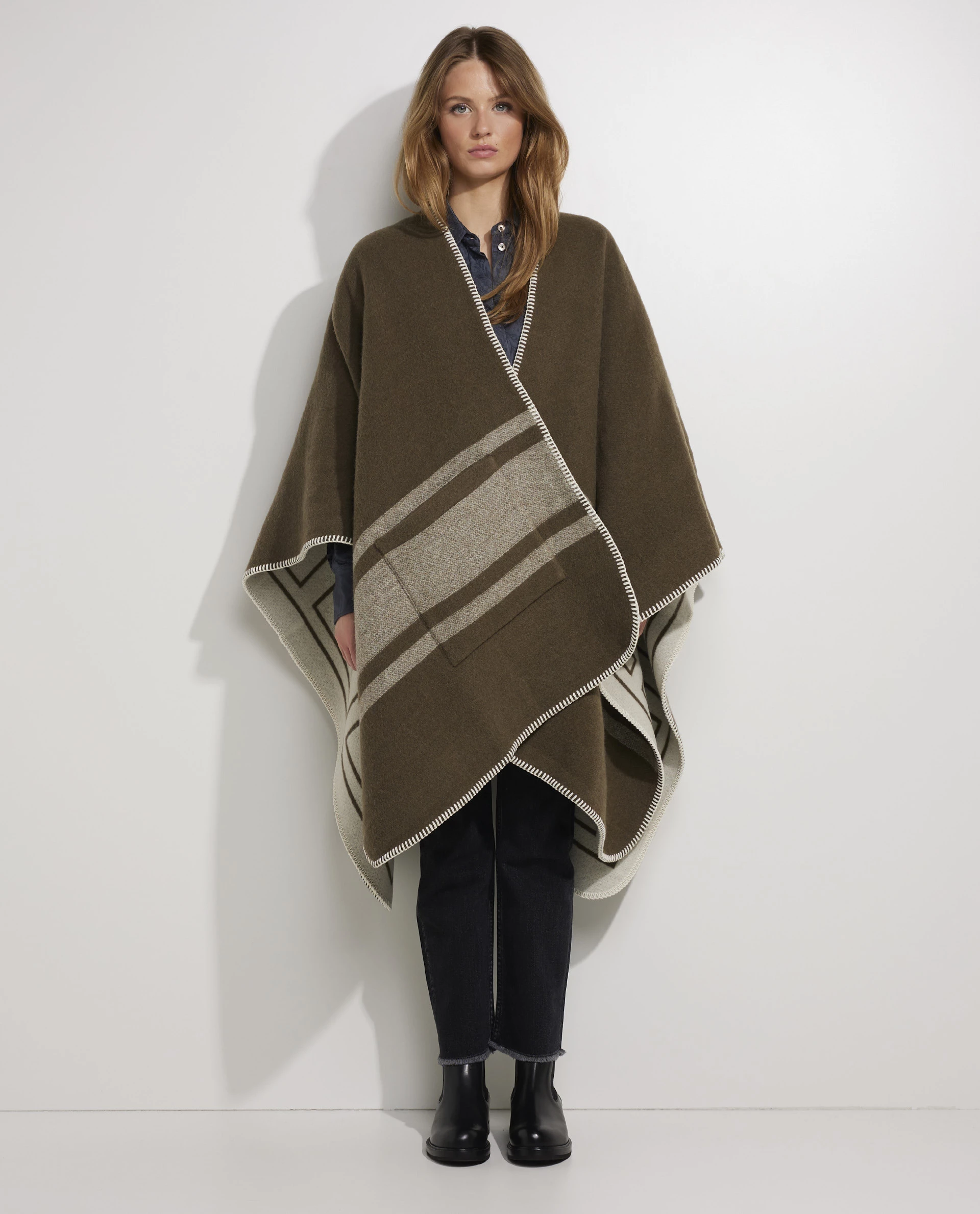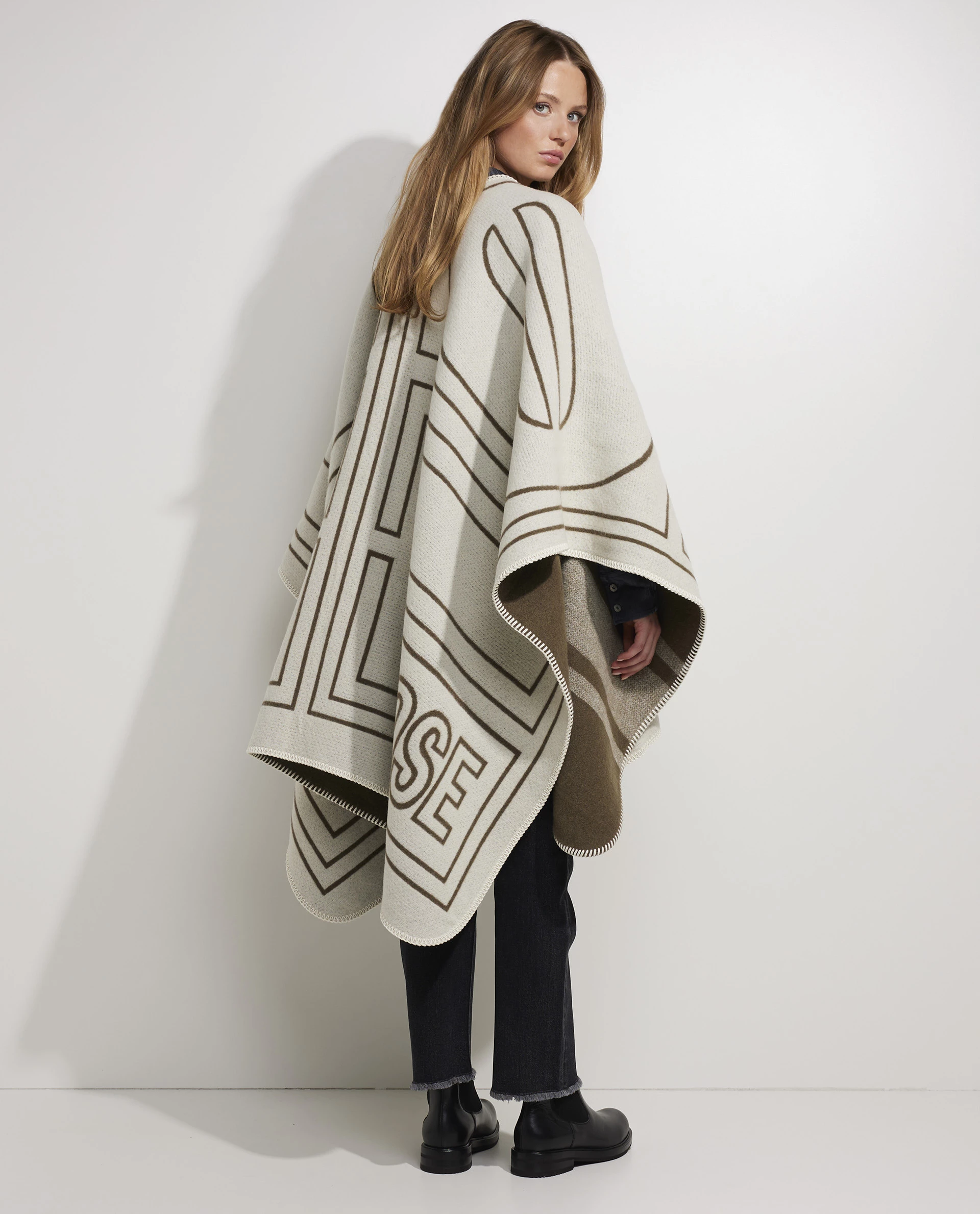 Cape from the Italian brand Golden Goose. This model is made of a wool blend. This soft cape is reversible which creates versitale looks.