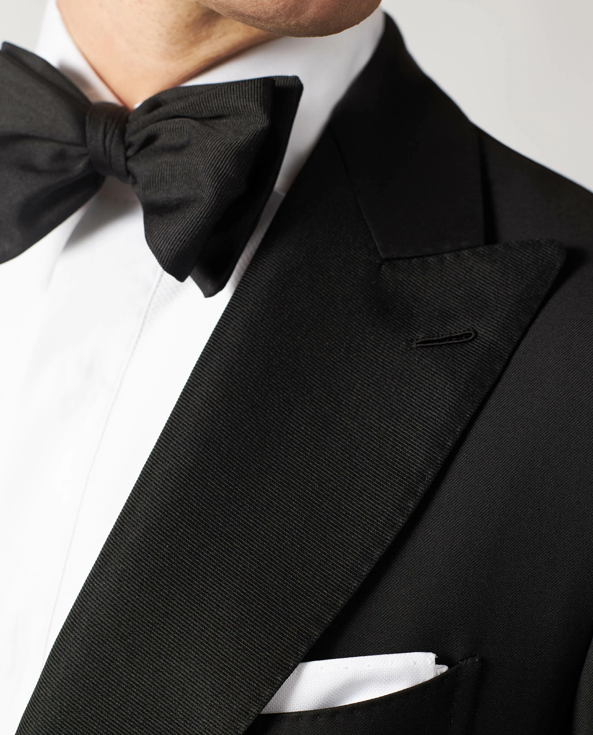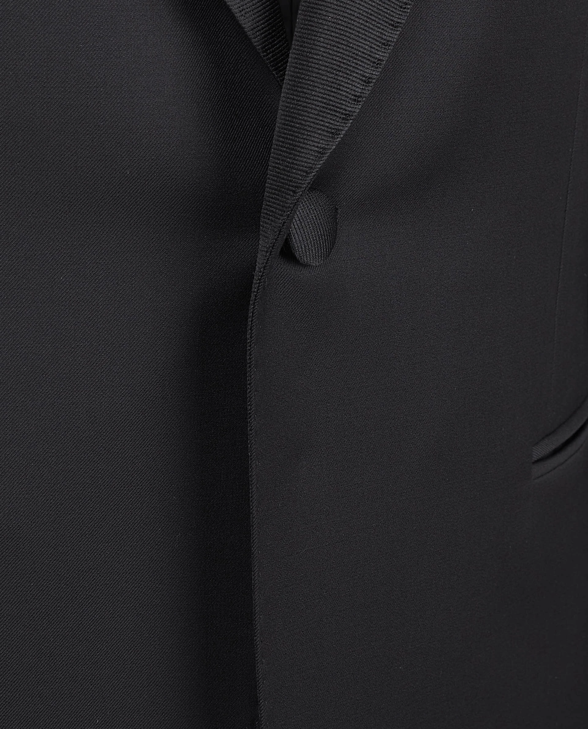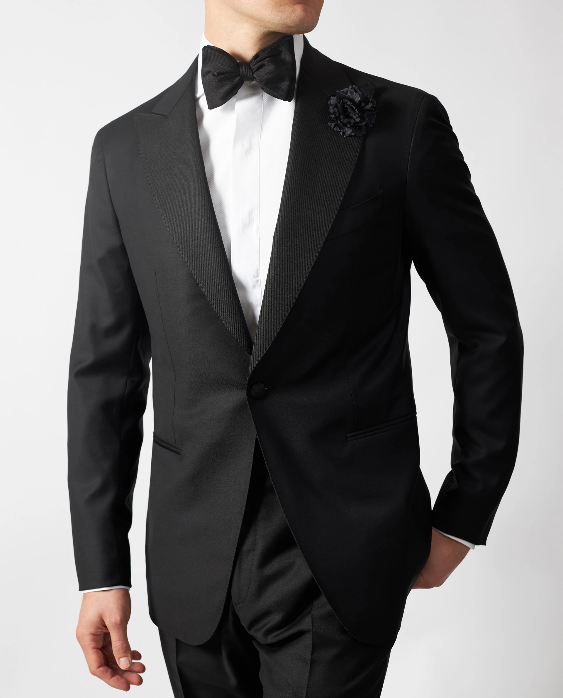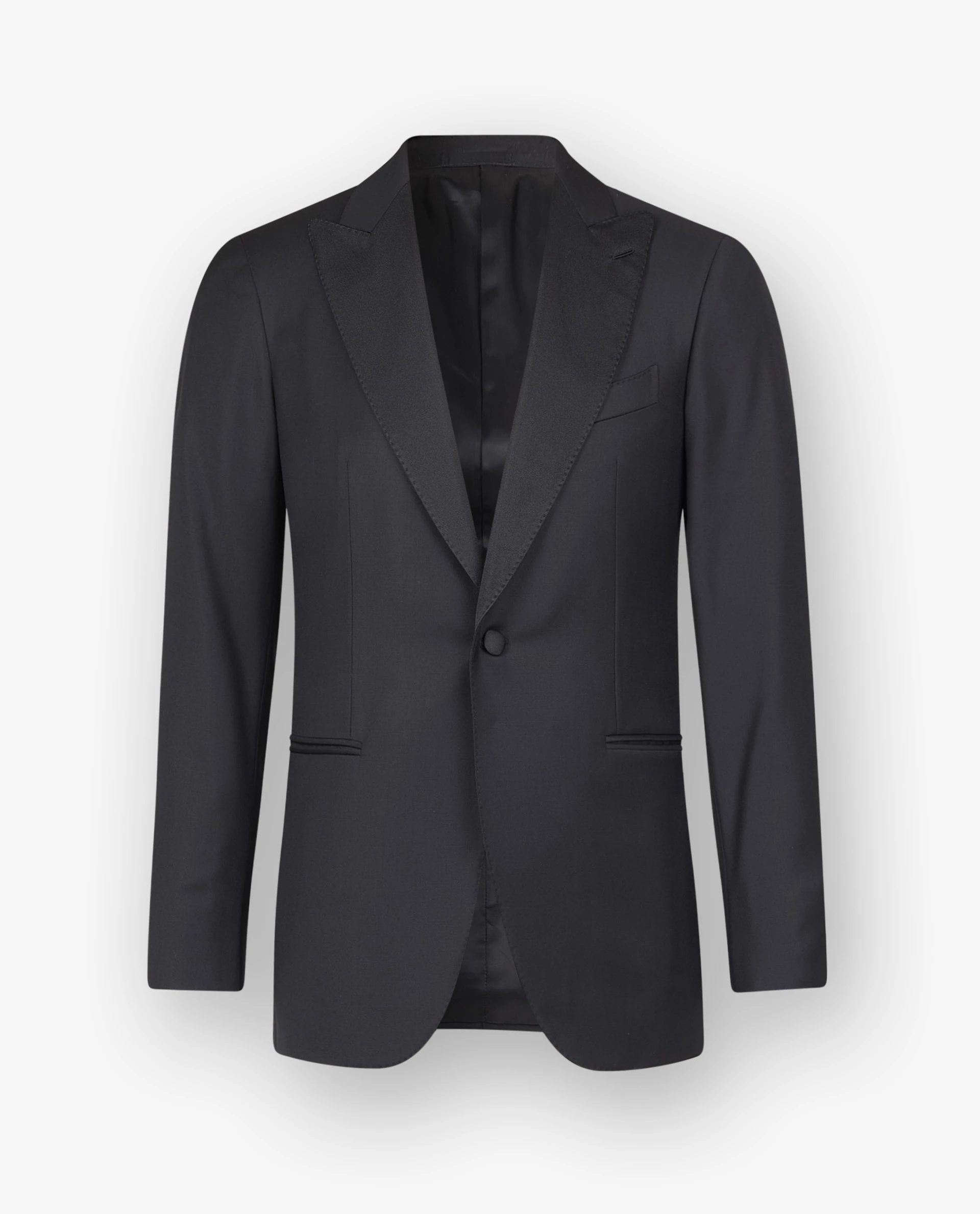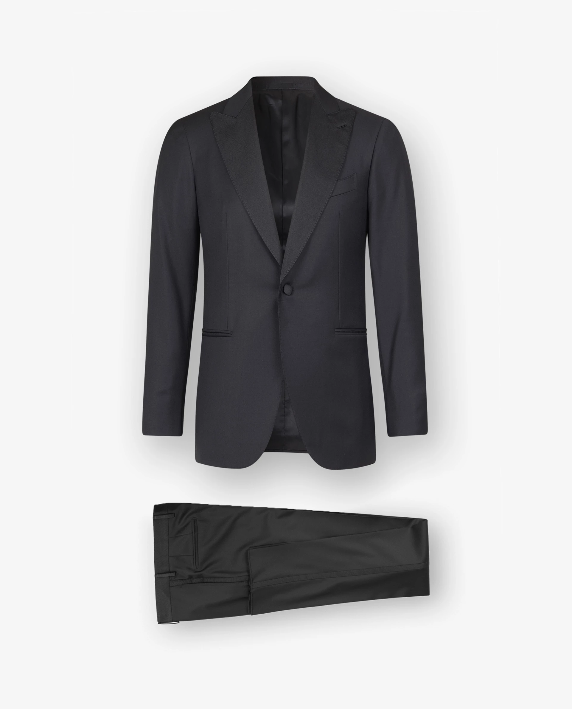This Caruso tuxedo is completely made of S150 wool. The jacket has notched lapels, welt pockets and 1 button closure. The pants and lapels are finished with a different woven fabric. Wear with a white shirt.